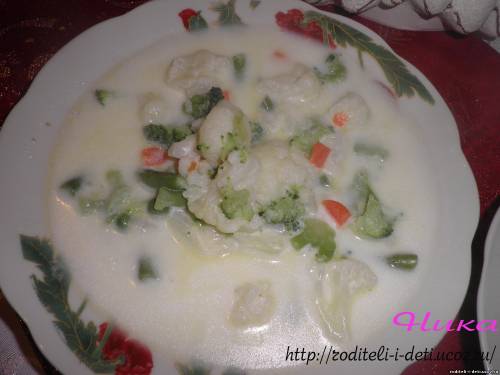 Воду наливаем в кастрюлю ждем пока закипит, потом добавляем все молоко. После закипания закладываем в кастрюлю овощи, ждем пока они чуть сварятся. Солим, сахарим, добавляем сливочное масло. И варим супчик до готовности овощей.